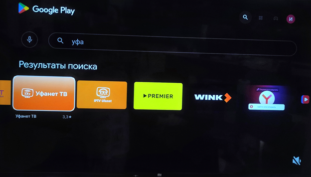 Находим значок лупы в правом верхнем углу и вводим в поисковую строку Уфанет ТВ. Заходим в приложение.
